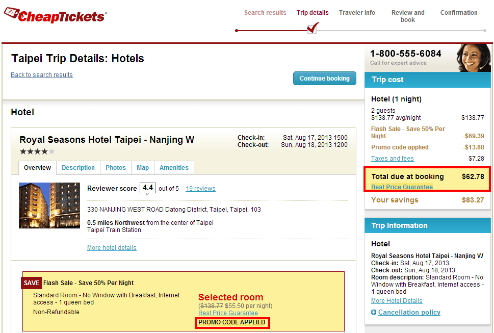 我們以8月17日入住,8月18日退房只需US$62.78,約港幣$490(已包稅)