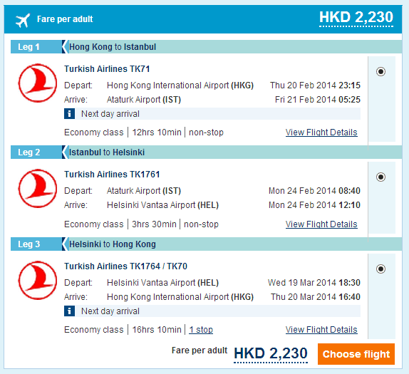 我地以2月20日香港飛伊斯坦堡,2月24日伊斯坦堡飛赫爾辛基,3月19日赫爾辛基返香港