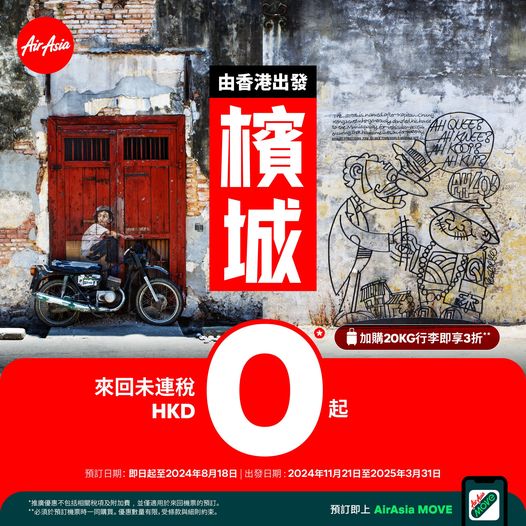 嘩!係$0機票!AirAsia還擊HK Express!$0飛檳城!明年3月31日前出發!香港飛檳城來回連稅只需$839起 – AirAsia (優惠至8月18日)