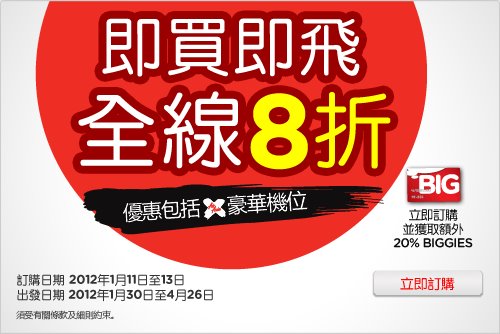 今次終於唔駛再神神秘秘啦,Air Asia 亞洲航空會係今天凌晨開始(1月13日12:00am) 一連三天 所有航線八折優惠