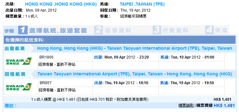 先講$780呢口價,只適用4月9日坐 BR1866 23:20 出發 或 4月10日 坐 BR1868 01:05 出發