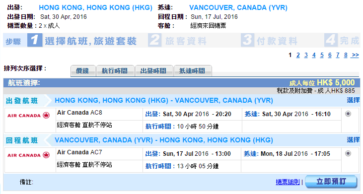 經我們測試,以溫哥華4月30日出發,7月17日返回為例