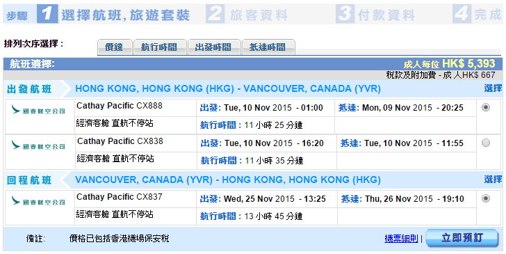 經我們測試,以溫哥華3月10日出發,3月25日返回為例