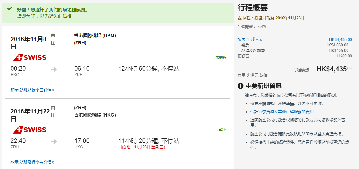 香港直航往返蘇黎世只需$4,030,連稅$4,435,直航黎講都幾抵