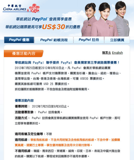 第二季中華航空xPayPal 付款每張機票減$155既優惠7月20日完左啦,仲以為唔會再繼續添