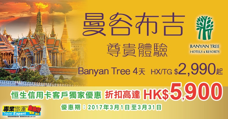專業旅運 x 恒生信用卡推出左獨家優惠,曼谷4日3夜套票只需$2,900起,連稅$3,382起