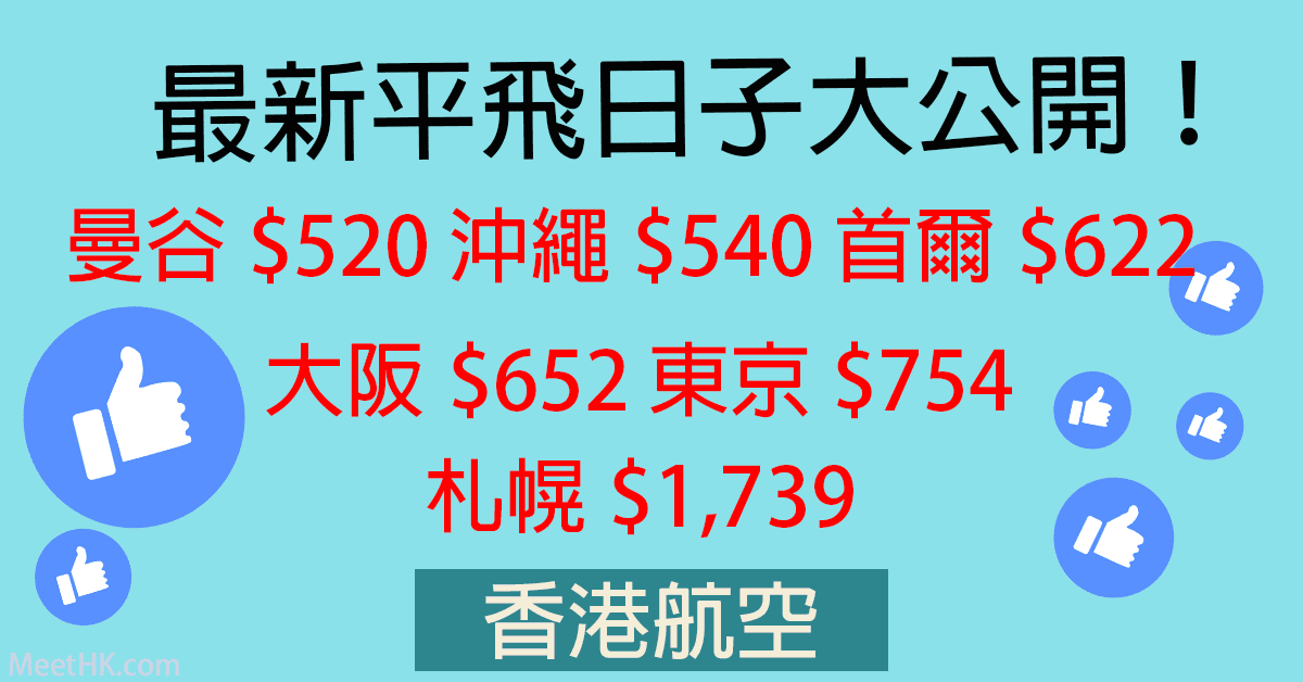 曼谷$520 、沖繩$540、首爾$622、大阪$652、東京$754、札幌$1,739,價錢無得輸,仲包20kg行李,勝過坐廉航!