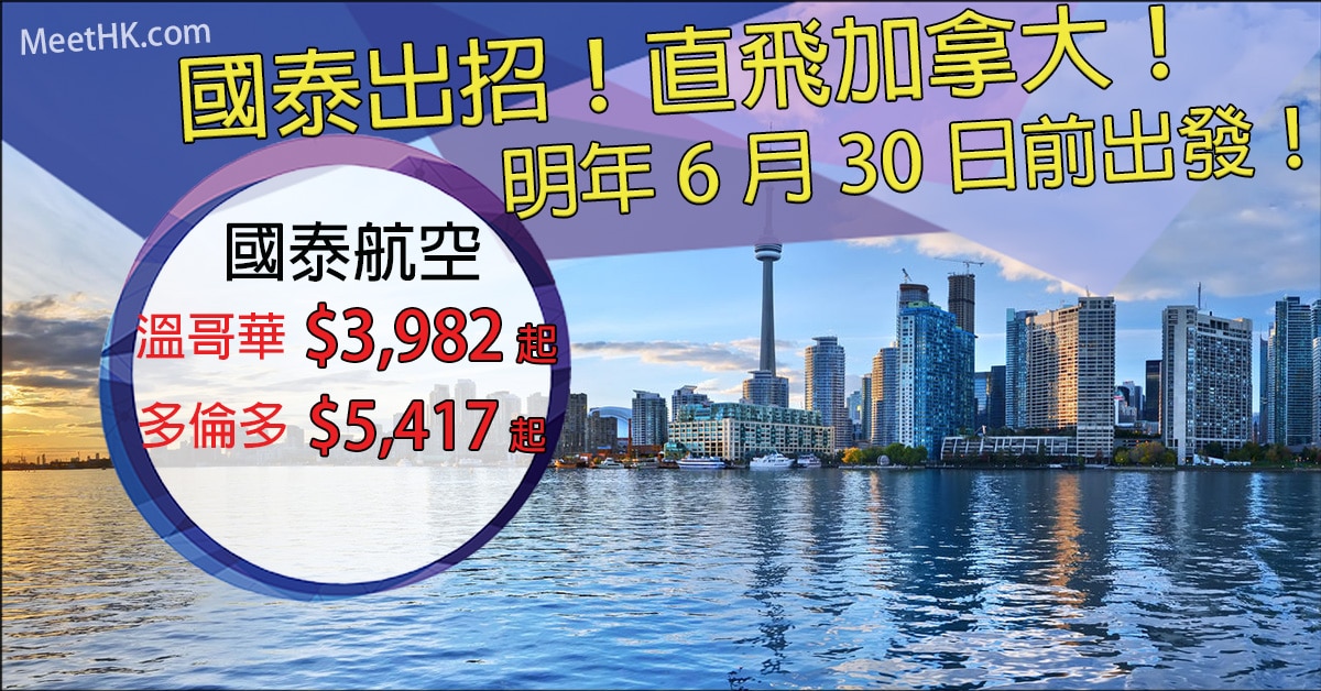 香港往返溫哥華只需$3,982起,連稅$4,685起;多倫多$5,417起,連稅$6,123起