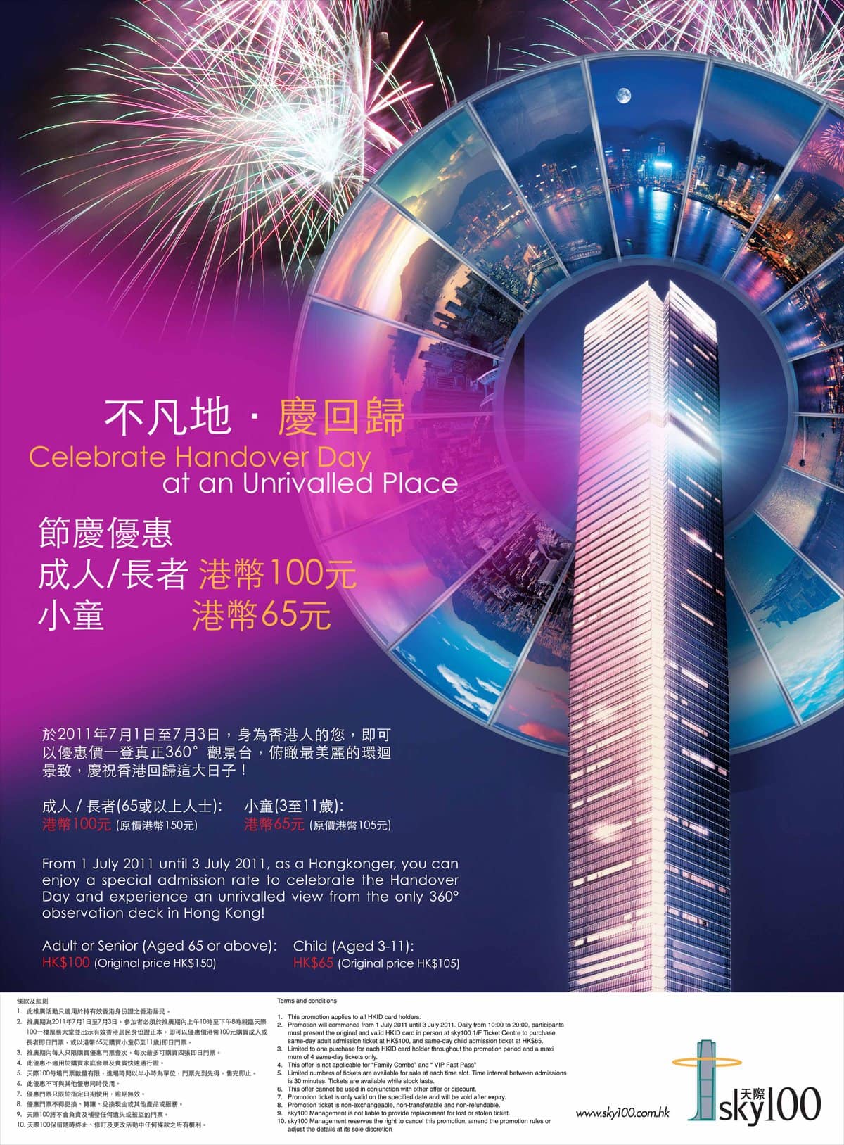 為慶祝香港回歸的大日子,「天際100」推出「7‧ 1慶回歸尊享禮遇」,凡於7月1日至3日(周五至周日)上午10時至晚上8時親臨天際100一樓票務中心出示香港身份證正本購買即日門票,可尊享高達六六折的優惠,以推廣價港幣100元購買成人及長者即場門票,讓訪客可以特惠價登上這個真正360度及備有互動多媒體設置的「天際100」觀景台之餘,亦可細味香港回歸以來的種種在基建上及社區的變遷。