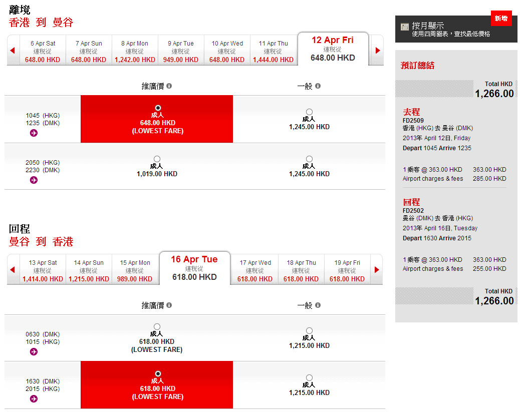 提提大家,復活節長假期前後一定唔會有平飛,其他日子大家可以用亞航既”按月顯示”功能一次過睇清楚究竟邊日有平
