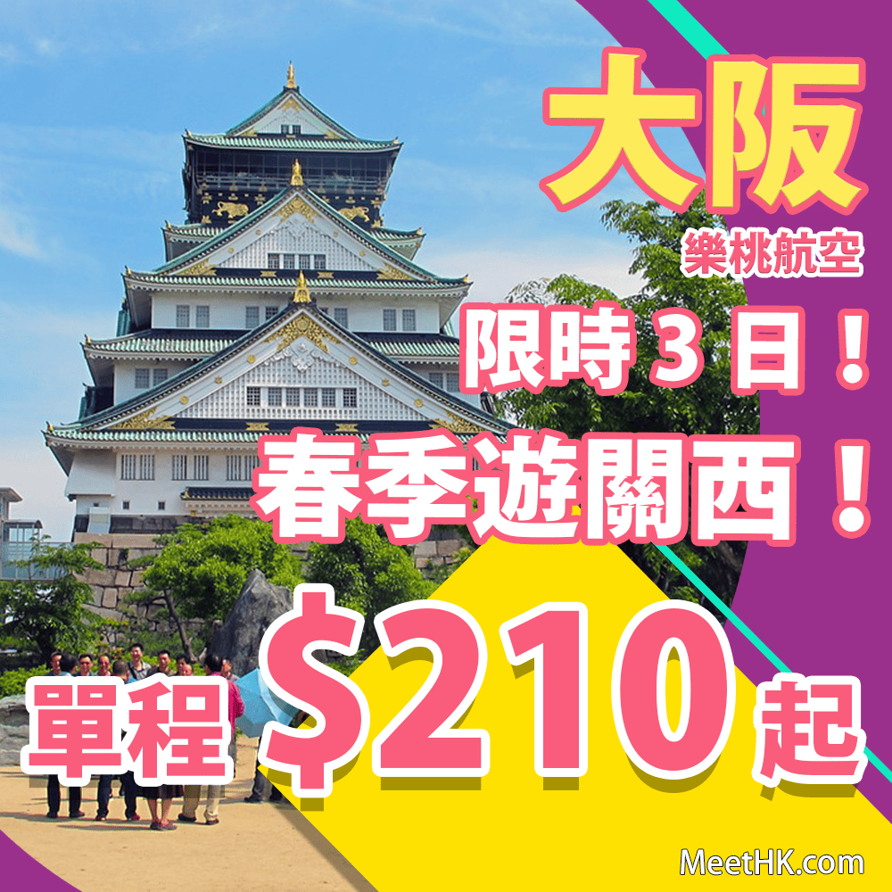 單程低至$210!限時72小時!來回大阪連稅九百幾起!春季遊關西!香港飛大阪單程只需$210起 – 樂桃航空 (優惠至2月19日)