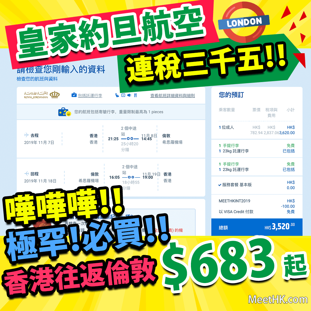 嘩嘩嘩!極罕!神價平飛倫敦!連稅三千五咋!皇家約旦航空瘋狂減呀!香港往返倫敦只需$683起 – 皇家約旦航空 (優惠至10月1日)