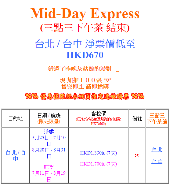 台北方面去程限坐下午2點前出發既航班又或者晚上8點打後出發既航班,回程無航班限制,航班選擇都幾多下
