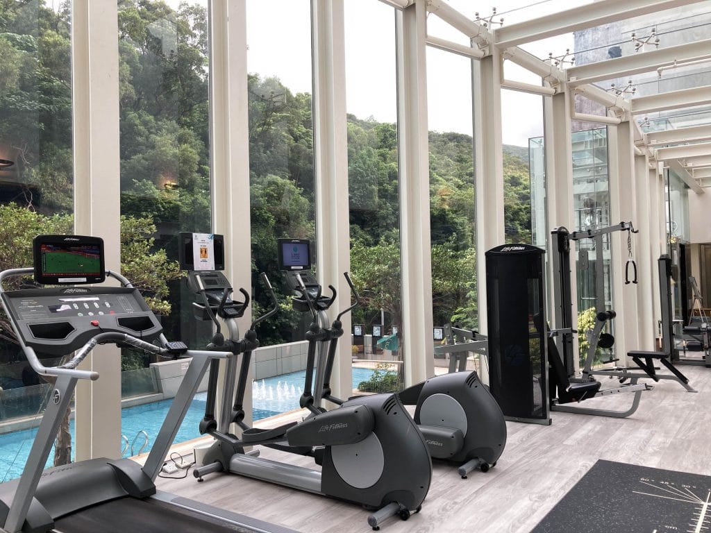 酒店嘅gym room有落地大玻璃,可以望住山景同室外泳池,夠曬chill~