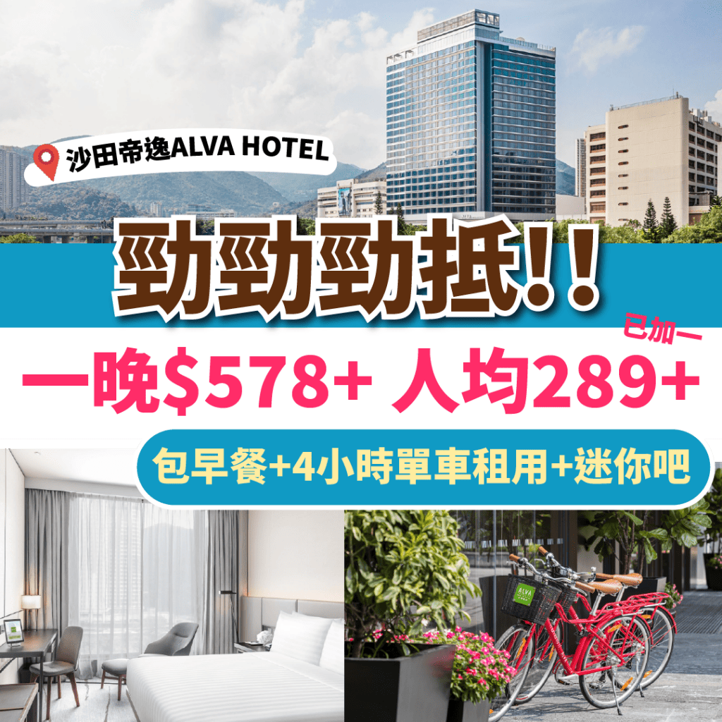 【沙田帝逸酒店ALVA HOTEL BY ROYAL優惠】勁勁勁抵!一晚連服務費$578起入住,人均289起!包早餐+免費4小時單車租用+迷你吧!