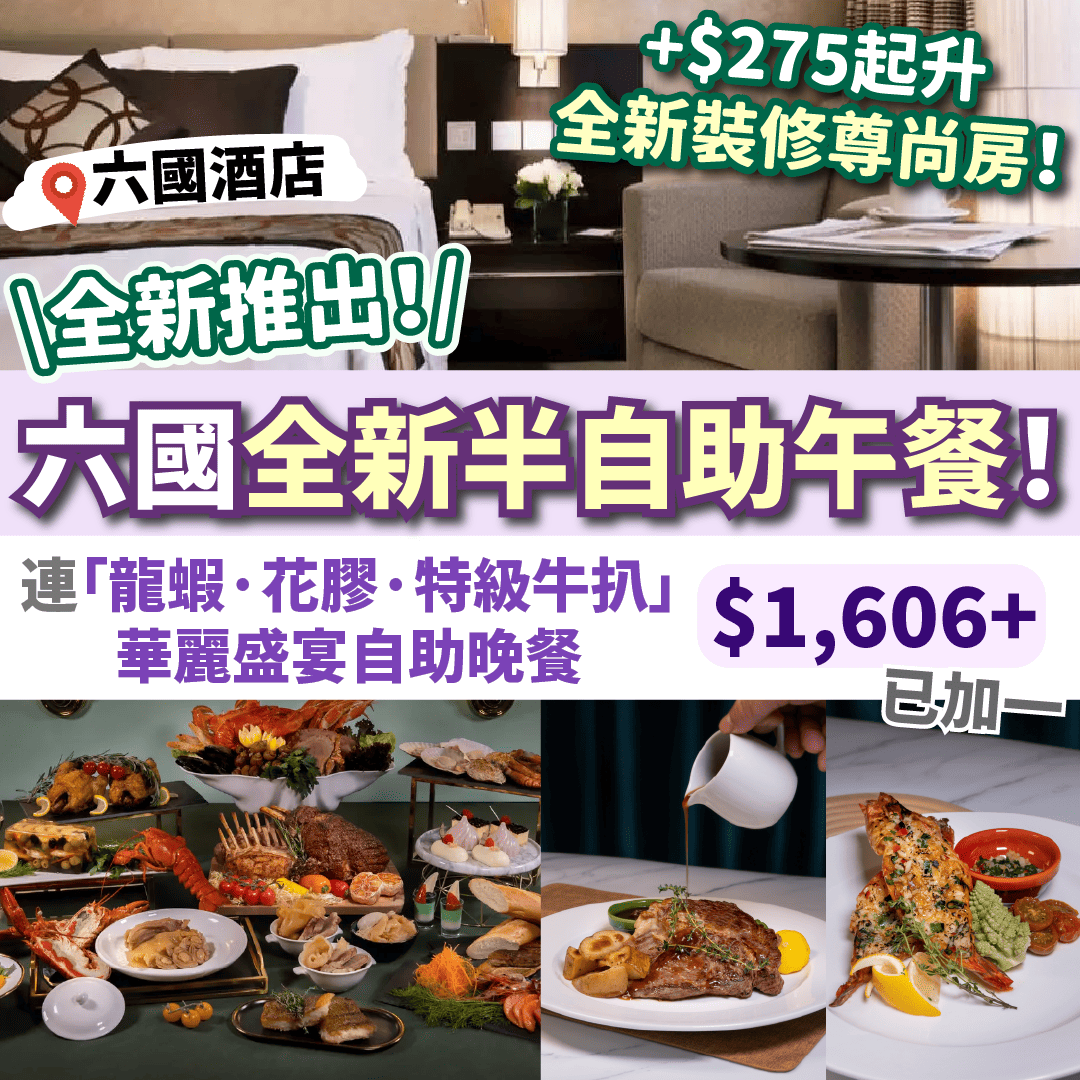 突發!六國酒店(Gloucester Luk Kwok Hong Kong)今晚10pm將推出全新半自助午餐 +「龍蝦·花膠·特級牛扒」自助晚餐staycation優惠,一晚連服務費$1,606起!+$275起升全新裝修尊尚房!自助晚餐必食波士頓龍蝦、加拿大雪花蟹腳、澳洲加菲蟹等海鮮!仲美國特級有骨肉眼、片皮鵝、鐵板鴨肝!當然唔少得試燴花膠、蠔皇扣鮑魚啦!甜品就有即製窩夫、芒果拿破崙、焦糖蘋果芝士蛋糕等!超吸引!另外全新推出嘅半自助午餐都相當豐富!主茶可以10選1,分別有希臘燒雞、德國咸豬手、日本黑豚定食、紐西蘭羊架等!自助方面就有沙律吧、意大利前菜同餐湯可以任食!