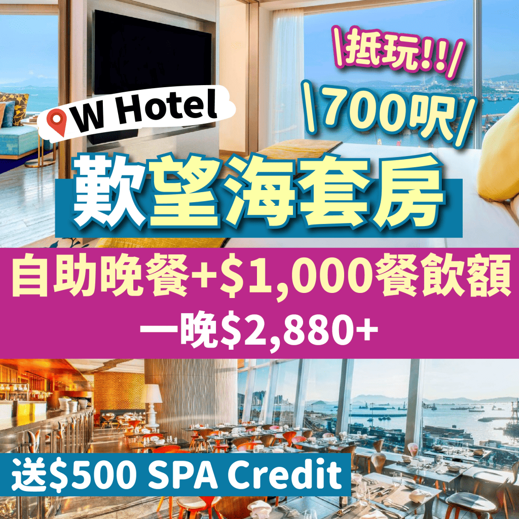 【香港W酒店W Hotel優惠】抵歎超大望海套房Suite!雙人自助晚餐+$1,000餐飲消費額,一晚$2,880起!再包埋$500 SPA credit!