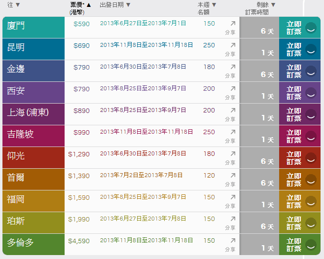 (廈門$590 連稅$1,225)、(昆明$690 連稅$1,325)、(西安$790 連稅$1,425)、(金邊$790 連稅$1,505)、(上海$890 連稅$1,525)、(吉隆坡$990 連稅$1,673)、(仰光$1,290 連稅$1,888)、(首爾$1,390 連稅$2,109)、(褔岡$1,590 連稅$2,189)、(珀斯$1,990 連稅$4,502)、(多倫多$4,590 連稅$6,844)