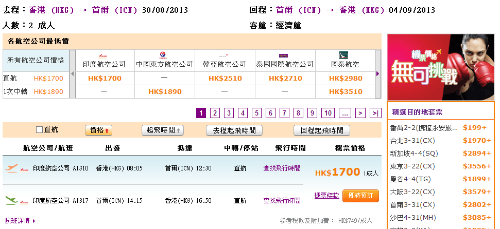 經我們測試,以首爾8月30日出發,9月4日返回為例