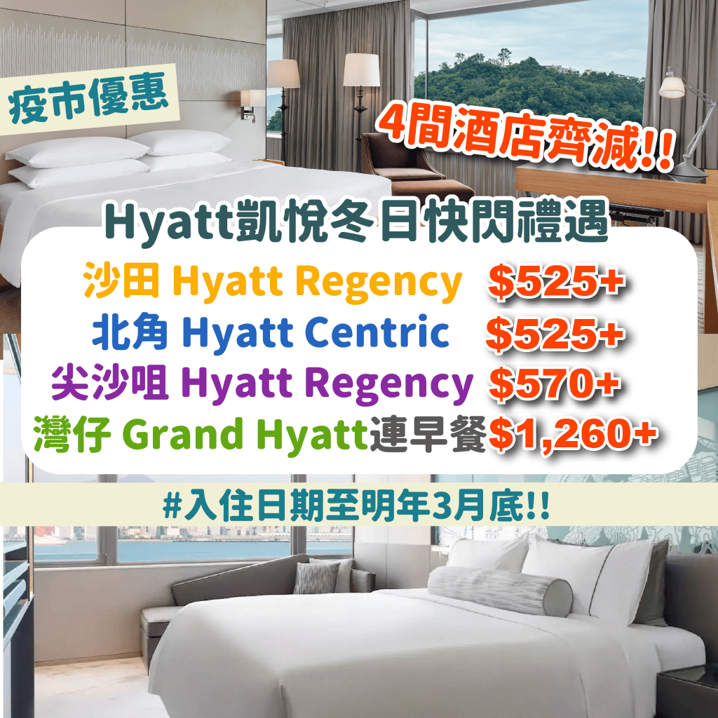 【Hyatt冬日快閃禮遇】香港4間Hyatt都有優惠!沙田Hyatt一晚$525起、北角Hyatt $525起、尖沙咀Hyatt $570起、灣仔Grand Hyatt連雙人早餐$1,260起!