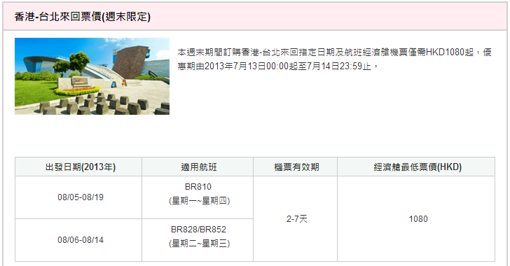 不過呢隻優惠航班選擇不多,星期二同三出發去程限坐 BR828 07:30-09:10、BR852 11:10-12:50、BR810 21:45-23:25