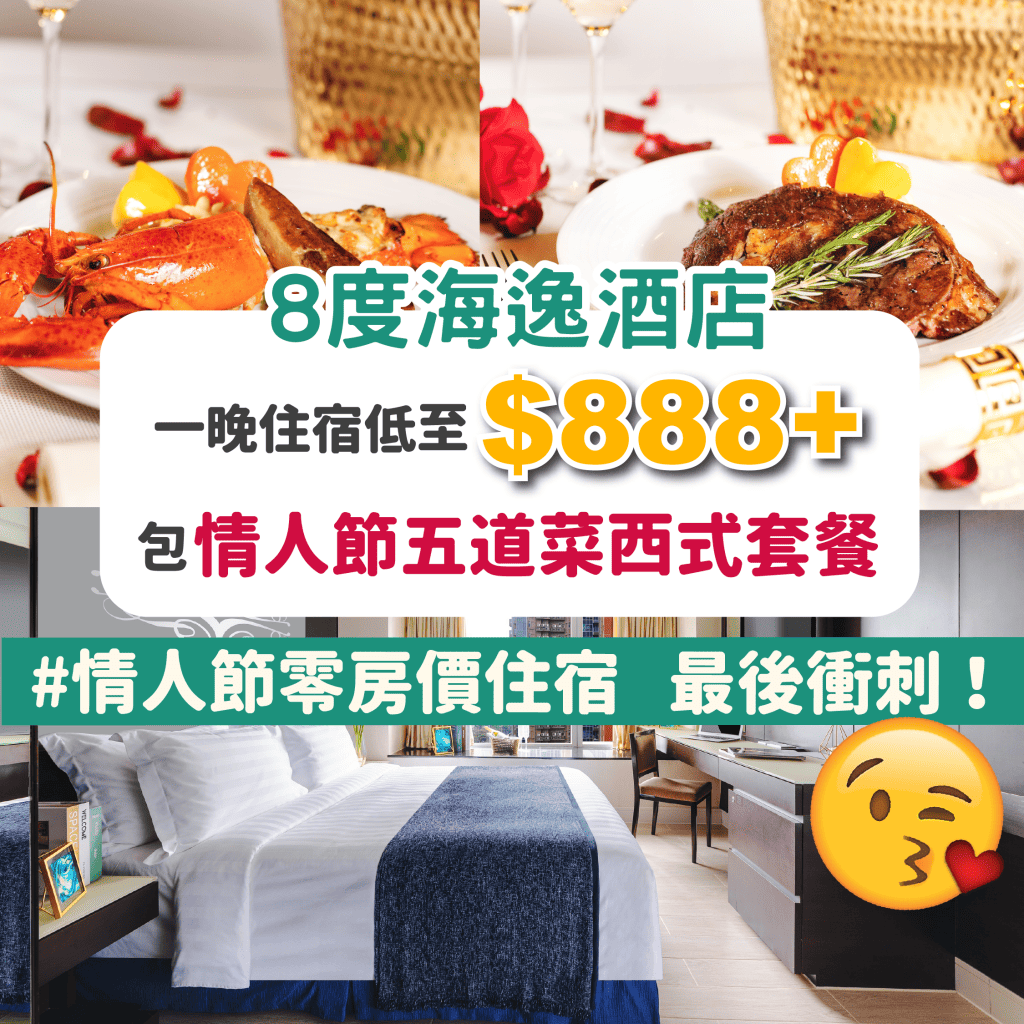 【8度海逸酒店Harbour Plaza 8 Degrees優惠】最後衝刺!加推2月12至15日情人節Staycation優惠!住宿連情人節五道菜西式套餐(價值$888)都只係$888起!等於「零」房價入住!