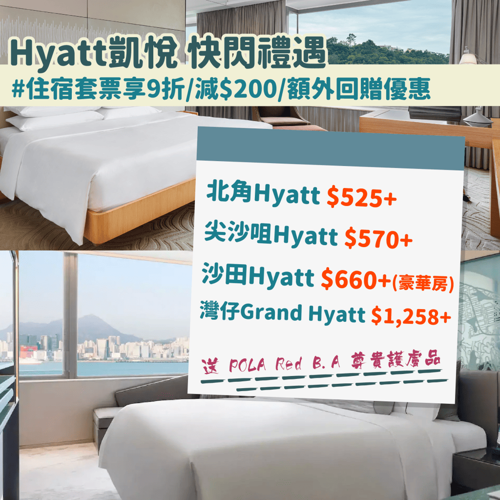限時5日!香港4間Hyatt齊齊推出快閃禮遇優惠!北角Hyatt Centric最抵!一晚都係$525起,大部份房型都睇到海景!尖沙咀Hyatt Regency一晚$570起!灣仔Grand Hyatt$1,258起!沙田Hyatt Regency$660起(沙田睇落好似貴咗,但今次優惠賣既係豪華房)!預訂今次優惠會再送一套 POLA Red B.A 尊貴護膚體驗套裝(價值$438),數量有限,送完即止!今次入住日期去到4月30日!另外,唔少原有嘅住宿套票都有額外優惠!