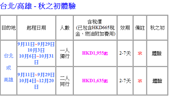 香港往返台北或高雄二人同行每人只需$970起 加埋稅亦都係$1,635起 好抵