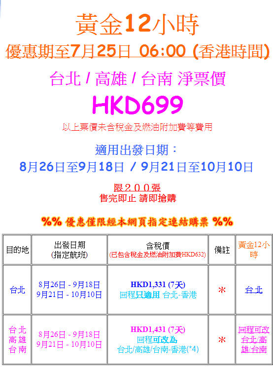 搶呀!限時12小時!一人成行!名額200個!香港往返台北只需$699,台北、高雄、台南$799(可以open jaw) – 中華航空 (優惠至7月25日6am)