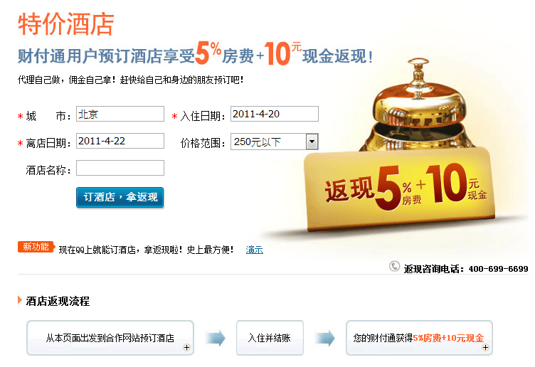 騰訊財付通用戶經藝龍旅行網預定酒店可享5%房費+10元現金返現