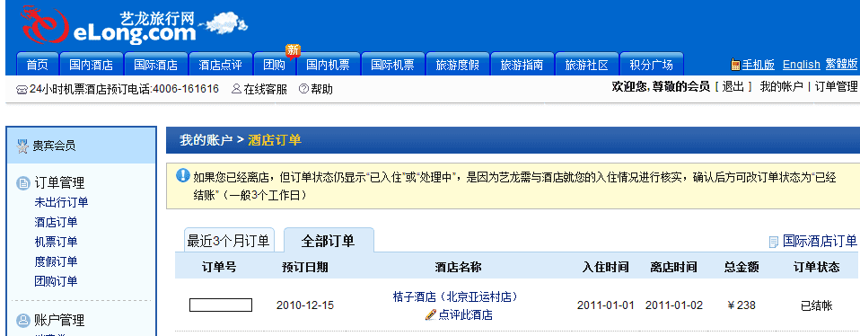 騰訊財付通用戶經藝龍旅行網預定酒店可享5%房費+10元現金返現,之前去北京就係係呢個網去訂了桔子酒店(北京亞運村店)一天,¥ 238。