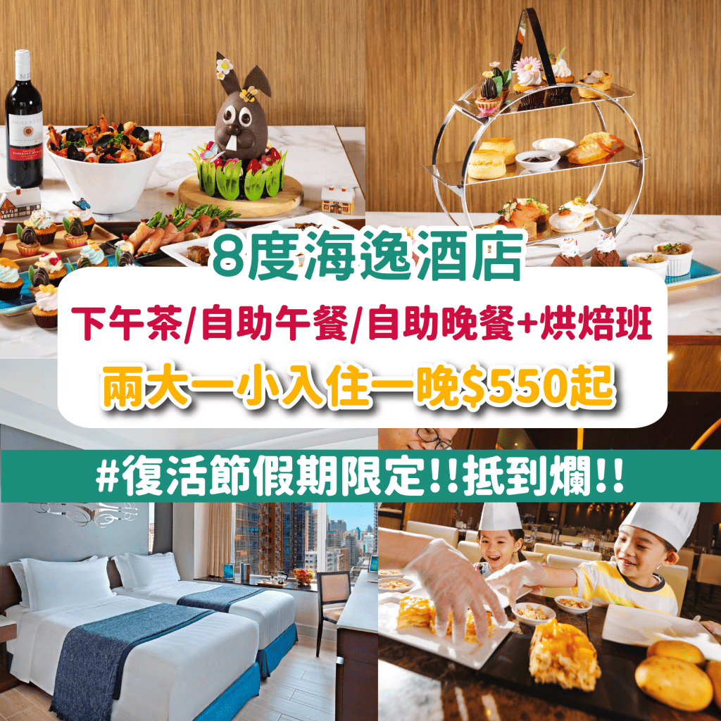【8度海逸酒店Harbour Plaza 8 Degrees優惠】嘩嘩嘩!復活節親子好去處!下午茶/自助午餐/自助晚餐+烘焙班,兩大一小入住一晚$550起!抵到爛!