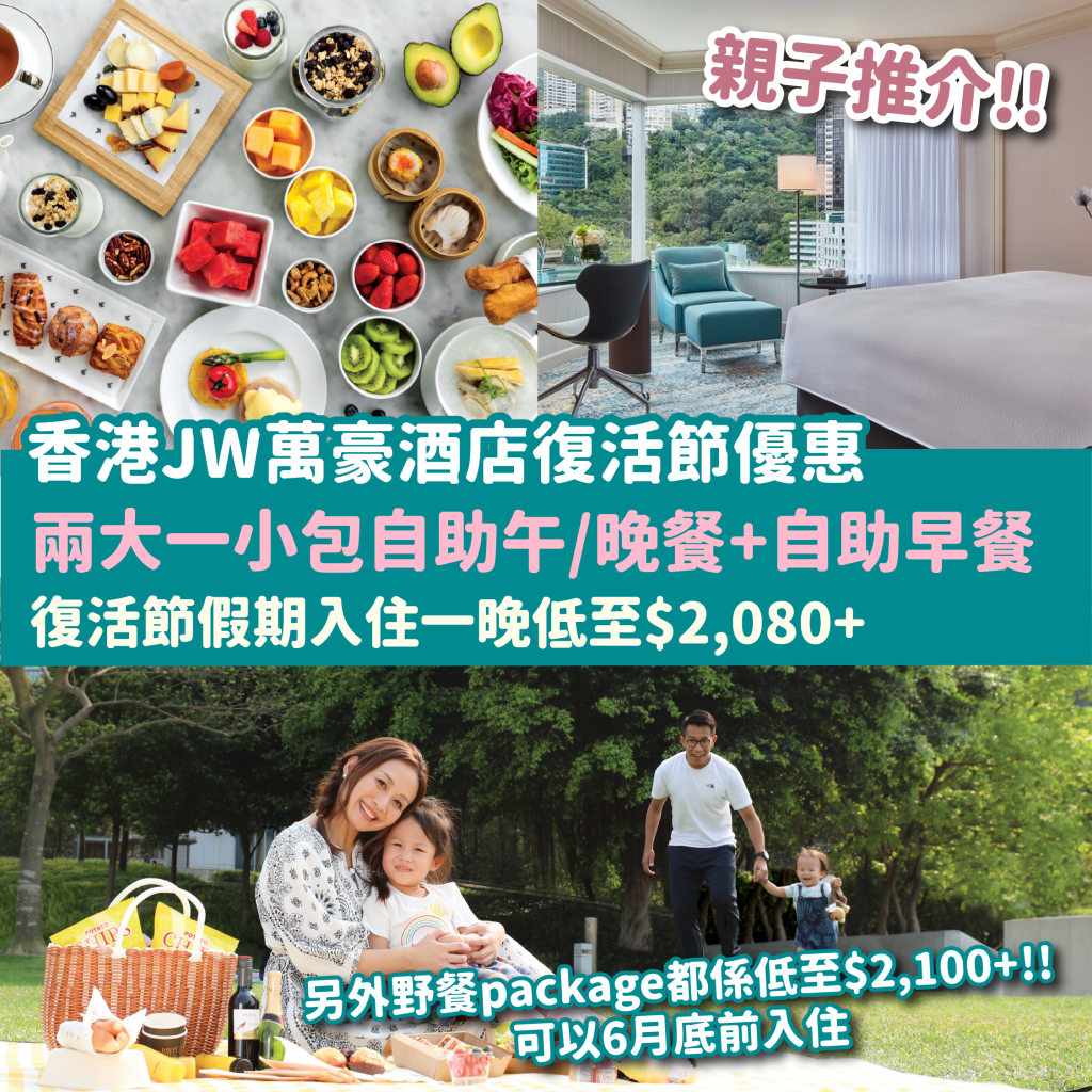 【香港JW萬豪酒店復活節優惠】抵呀!復活節親子staycation!兩大一小住宿包自助午/晚餐+自助早餐,一晚低至$2,080!另有戶外野餐package,包JW野餐籃+自助早餐+房內迷你吧一次!