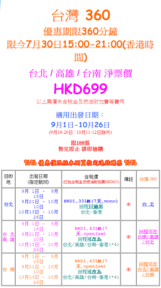 搶啦!只限6小時!一人成行優惠!香港往返台北只需$699,台北、高雄、台南$799(可以open jaw) – 中華航空 (優惠至7月30日9pm)