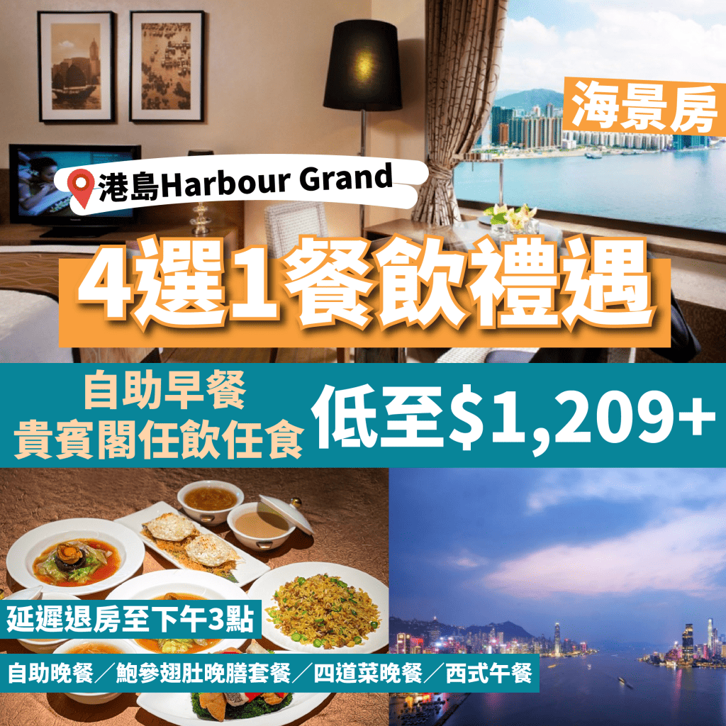 【港島海逸君綽酒店Harbour Grand Hong Kong優惠】抵呀!住宿包自助早餐+貴賓閣任飲任食+4選1餐飲(自助晚餐/鮑參翅肚晚膳套餐/四道菜晚餐/西式午餐),海景客房一晚$1,209起!送英格蜜兒護膚禮劵!