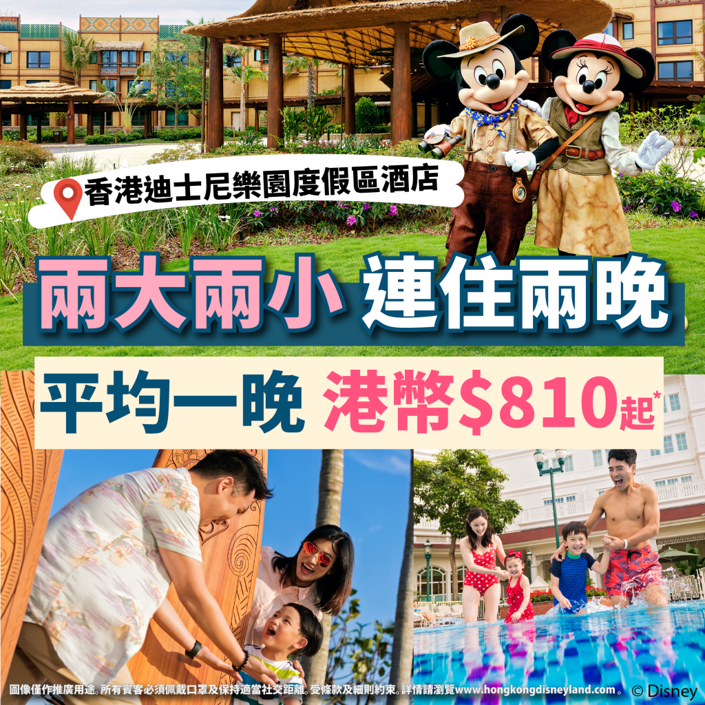 【香港迪士尼樂園度假區酒店2晚起奇妙住宿優惠】抵呀!限時即搶!暑假三日兩夜「偽旅行」!一家大細(兩大兩小)連住2晚香港迪士尼樂園酒店/迪士尼探索家度假酒店平均每晚港幣$810起*!