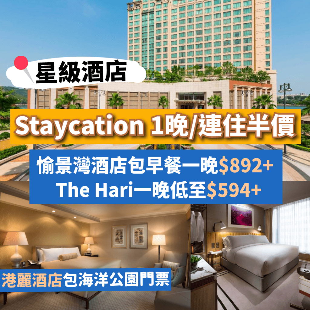 【Staycation半價優惠攻略】入住星級酒店連住兩晚低至半價!港麗酒店包兩大一小海洋公園門票連早餐平均一晚$1,634起!愉景灣酒店包早餐平均一晚$892起、The Hari平均一晚低至$594!