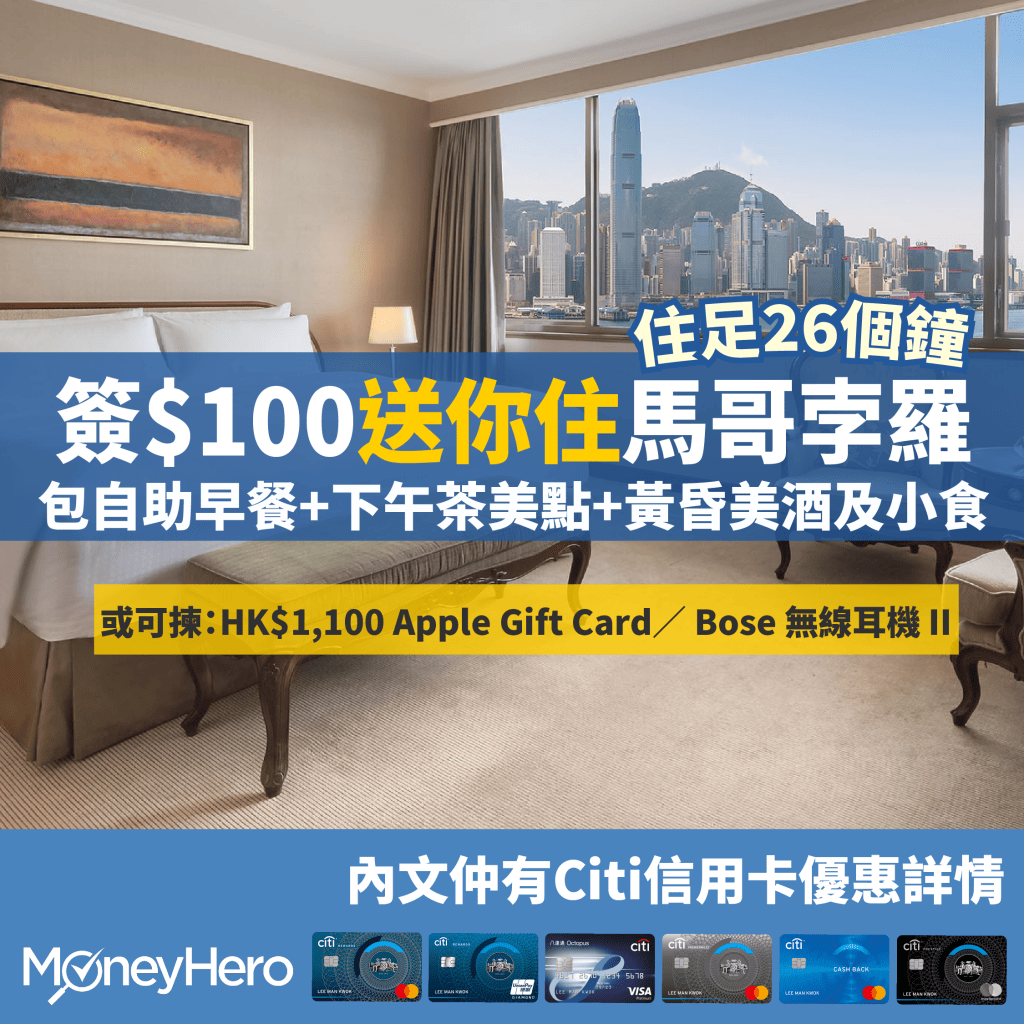 【簽$100送5星級酒店staycation?】推廣延長!新客戶申請指定Citi信用卡簽$100即送馬哥孛羅26小時酒店住宿包自助早餐+下午茶美點+黃昏美酒及小食!揀HK$1,100 Apple Gift Card亦得!兼享原有迎新優惠!