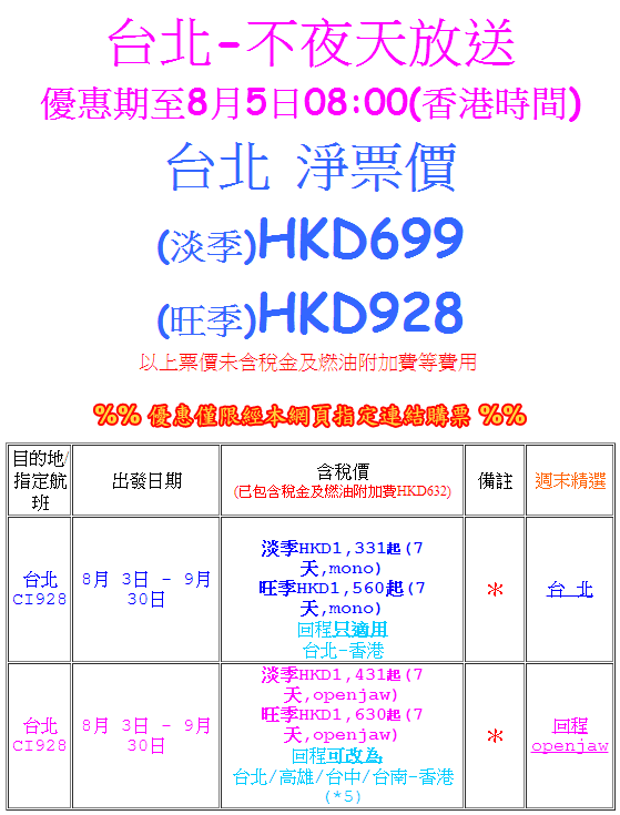 另外暑假旺季(8月3日至8月18日)都有優惠,香港往返台北只需$928,連稅$1,560。回程由高雄/台中/台南返既話,只需$998,連稅$1,630