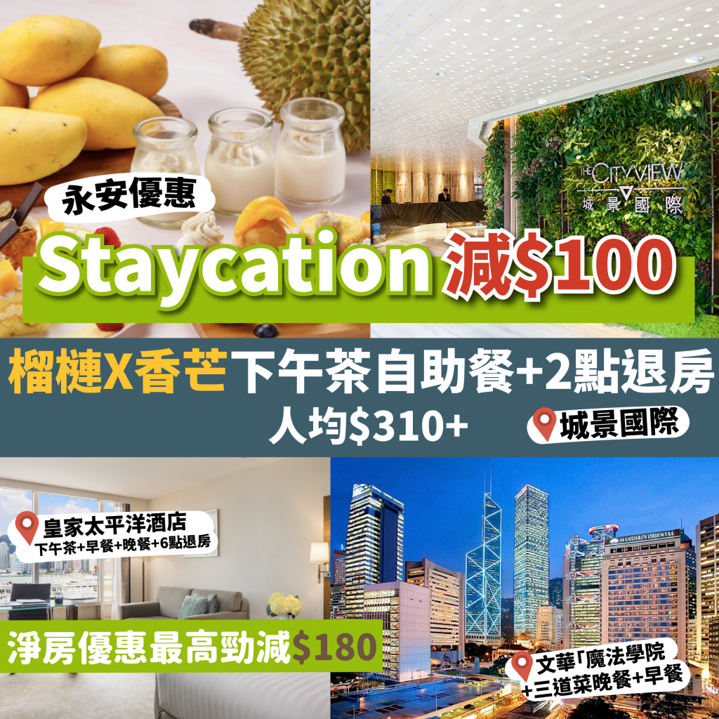 抵住staycation package推介!記得用埋永安旅遊推廣碼預訂,可以減多$100!仲不設最低消費!城景國際榴槤X香芒下午茶自助餐+2點退房,人均$310起!淨房價都有平,每滿$300即減$30優惠(最高勁減$180)!