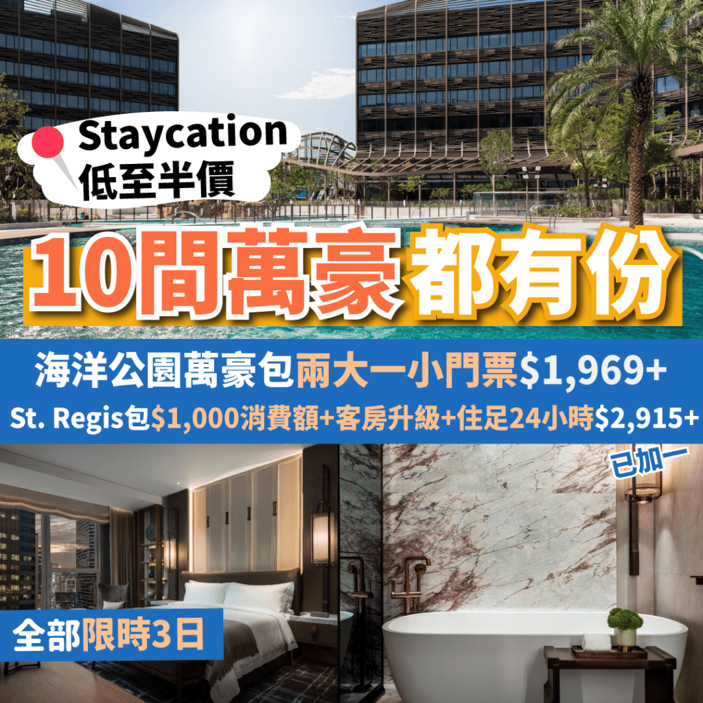 【Staycation優惠攻略】萬豪旗下酒店Staycation套票低至半價!有成10間萬豪酒店揀!St. Regis $1,000消費額+客房升級+24小時住宿,一晚連服務費$2,915起!海洋公園萬豪包兩大一小門票,一晚連服務費$1,969起!