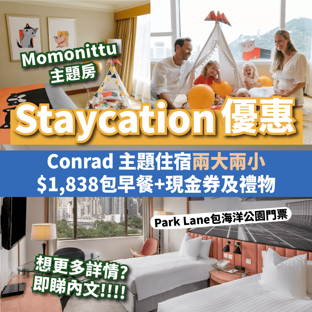 【親子Staycation優惠攻略】兩大兩小入住港麗酒店Momonittu主題住宿$1,838包早餐+現金券及禮物!$1,668起入住Park Lane包海洋公園門票+早餐+單程接送!