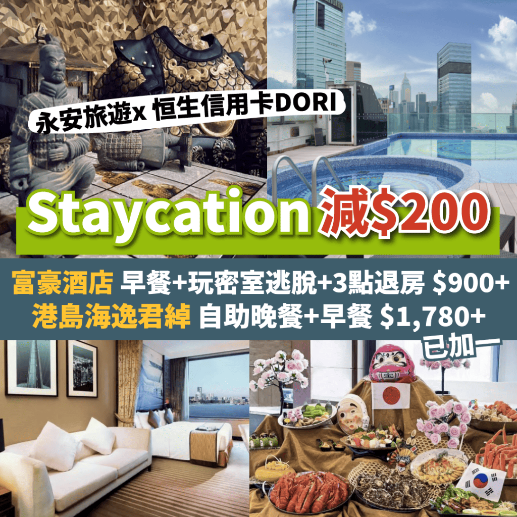 去Staycation想Relax下?而家永安旅遊 x 恒生信用卡DORI 推出全線香港Staycation食住玩套票激減優惠,拎推廣碼預訂即減$200!港島海逸君綽包自助晚餐+早餐,歎埋下午小點同黃昏雞尾酒,連服務費都係$1,560起!富豪香港連服務費$900起,包早餐+密室逃脫遊戲門票!有得玩有得食,孖住你身邊嗰個一齊放暑假啦!