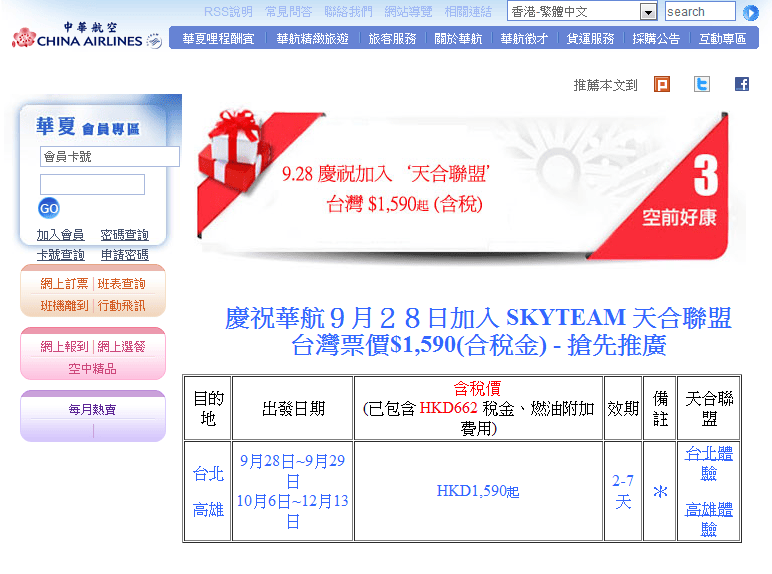 今天,中華航空為慶祝加入SKYTEAM天合聯盟,推出空前優惠,香港往返台北或高雄只需$928 (因為中華航空於9月28日加入SKYTEAM)