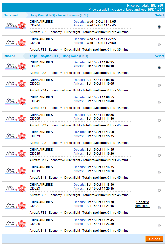 大家可去中華航空官網 或 ZUJI HONG KONG 查一下航班機位和訂購。