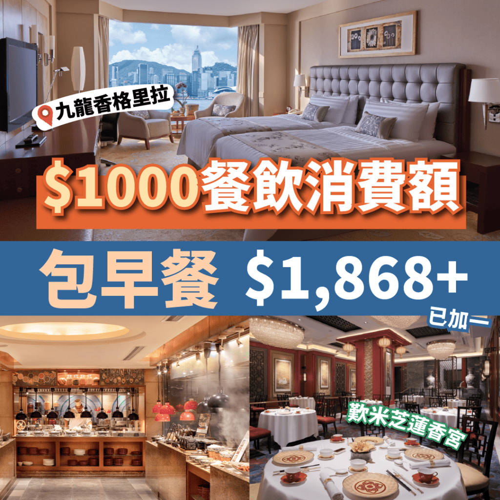 入住豪華大床/雙床房一晚連服務費$1,868起,雙人早餐+港幣1000元餐飲消費額