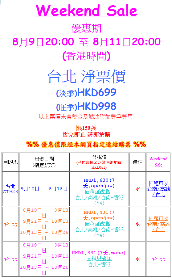 又到周末!華航都推出左隻限時周末優惠!同前日唔同,今次主打台北!優惠一人成行!