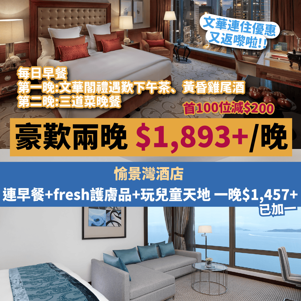 首100位減多$200,入住城市景觀客房兩晚連服務費$3,788起(平均一晚$1,893起),每天雙人早餐,首晚文華閣禮遇(下午茶、黃昏雞尾酒) + 次晚三道菜晚餐