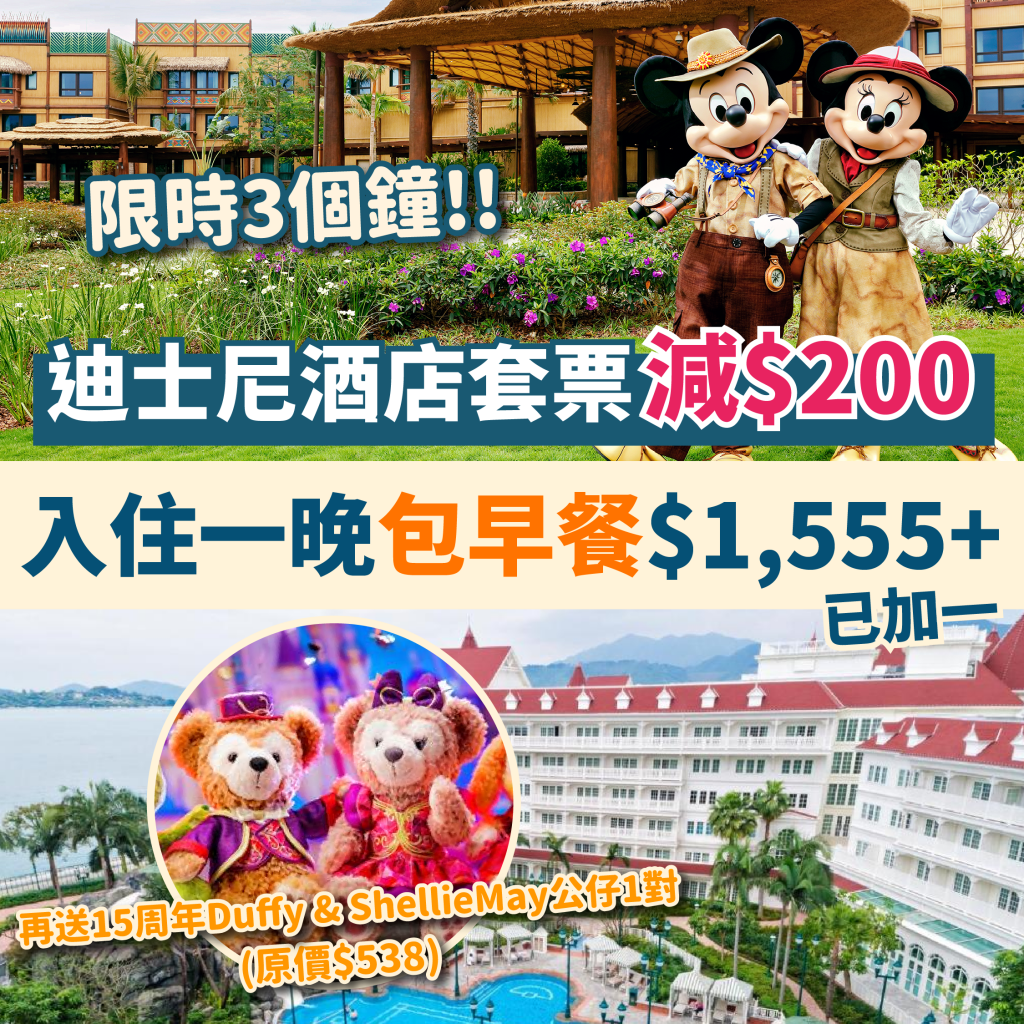 【爆賞星期三返黎喇】迪士尼酒店住宿套票每單減$200!包早餐!再送15周年Duffy & ShellieMay公仔1對(原價$538)!入住一晚連服務費$1,555起!