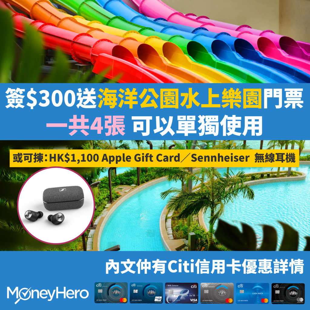 【送4張海洋公園水上樂園門票】新客戶申請指定Citi信用卡簽$300即送!或者揀HK$1,100 Apple Gift Card亦得!兼享原有迎新優惠!